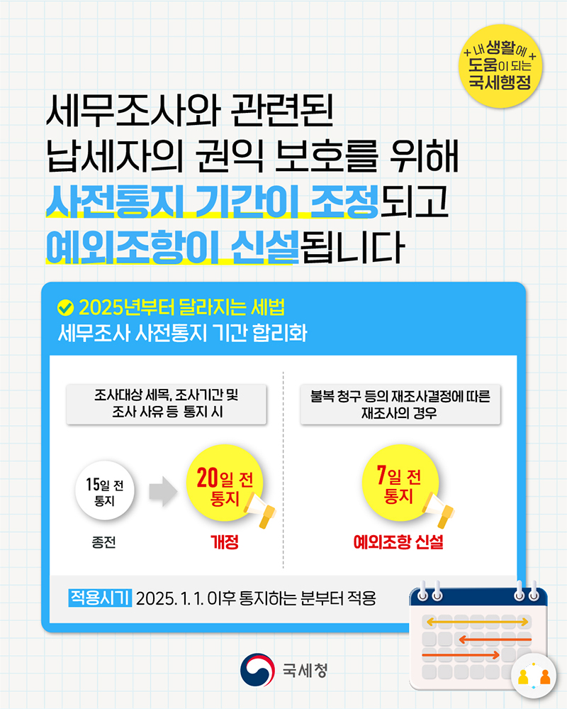 2025년부터 세무조사와 관련된 사전통지 기간이 변경되어 납세자의 권익 보호가 강화됩니다.